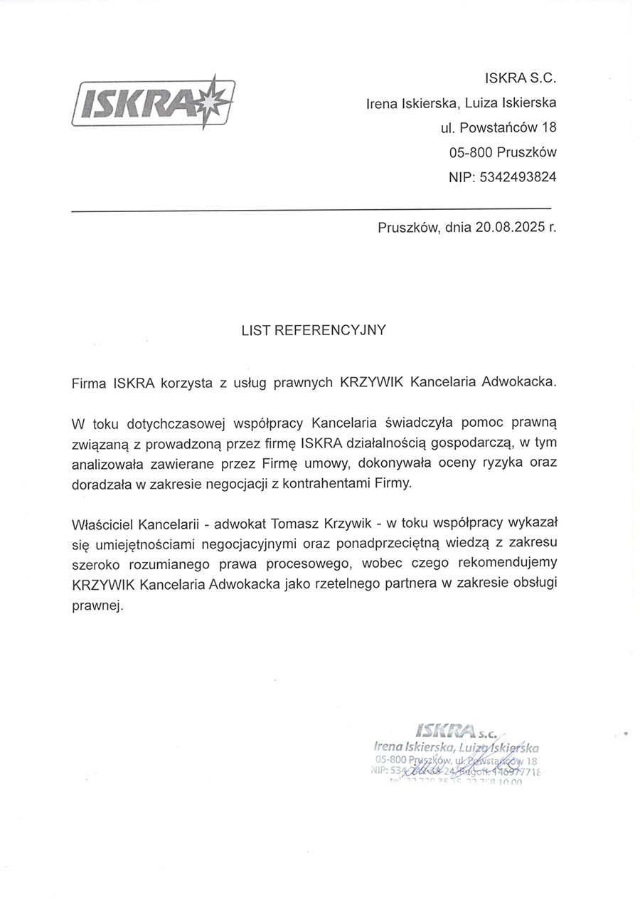 W dobie Sztucznej Inteligencji można dojść do błędnego przekonania, że wsparcie adwokata nie jest już potrzebne. Postawmy sprawę jasno: odpowiednie wykorzystanie powszechnie dostępnych wyszukiwarek pozwala uzyskać odpowiedzi na wiele pytań, nie jest także problemem uzyskanie wzoru pisma do samodzielnego wypełnienia. Mamy tego świadomość, ale zastanów się: czy Sztuczna Inteligencja pójdzie z Tobą na salę rozpraw? Czy będzie z Tobą na sali konferencyjnej podczas trudnych, wielogodzinnych negocjacji? Czy na pewno zrozumie Twoje potrzeby i dopasuje do nich projekt pisma?